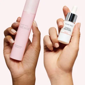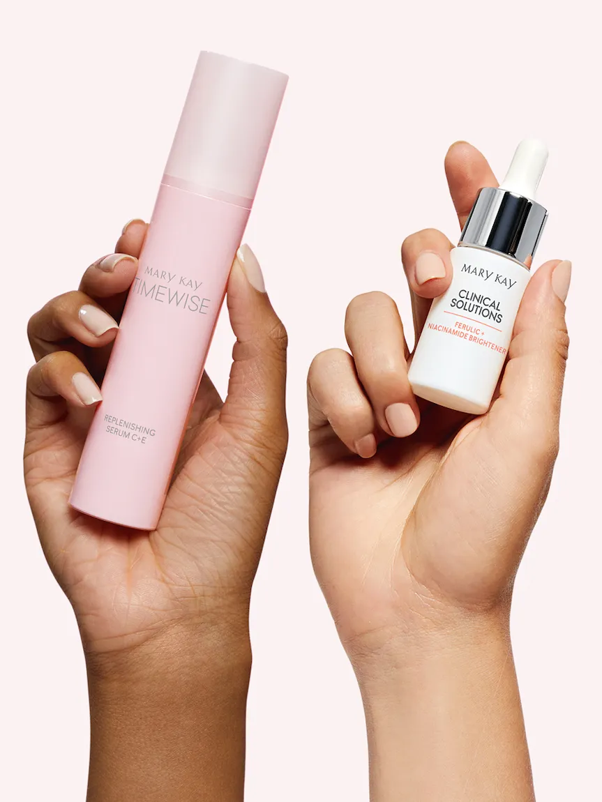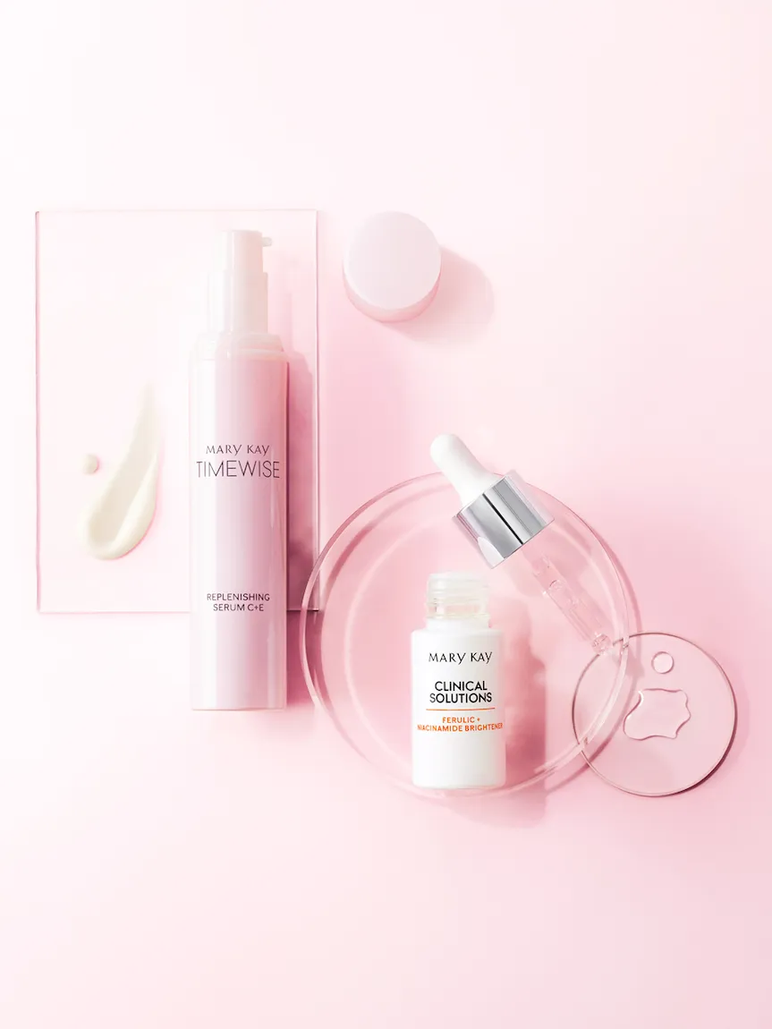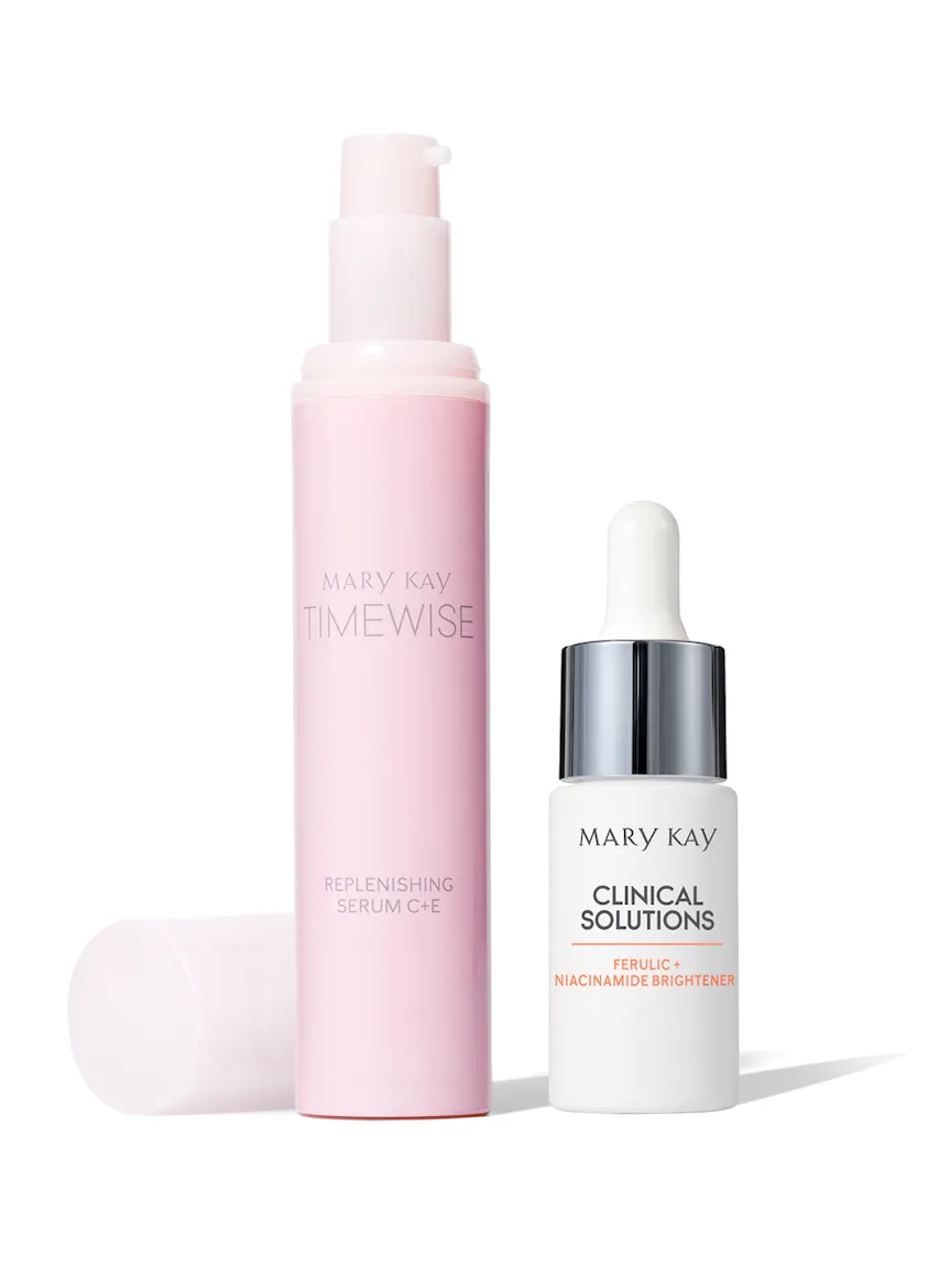 Your new go-“two” for glowing skin. Revive the appearance of dull skin, and harness the brilliance of this powerful pair featuring Mary Kay Clinical Solutions® Ferulic Niacinamide Brightener and TimeWise Replenishing Serum C E®. Our exclusive 3-2-1 Glow Technology features three sources of vitamin C, two powerhouse brighteners and one patented ingredient technology. These components are all packed into this potent pair, delivering a more radiant, even-toned complexion in just 4 weeks!* Reach for the dynamic duo that’s better together, and go from dull to ready, set, glow. †Available while supplies last*Based on independent third-party clinical studies in which 30–39 women used each product as directed